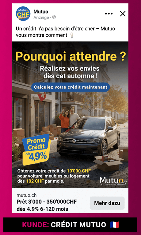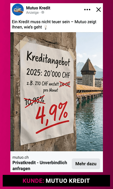 Für Kreditunternehmen Mutuo habe ich Meta Ads Kampagnen und Creatives umgesetzt und die Lead-Kosten um 35 % gesenkt.