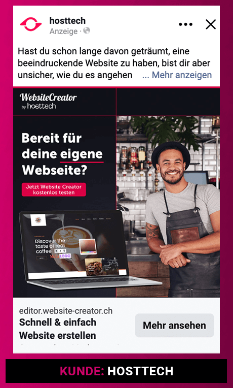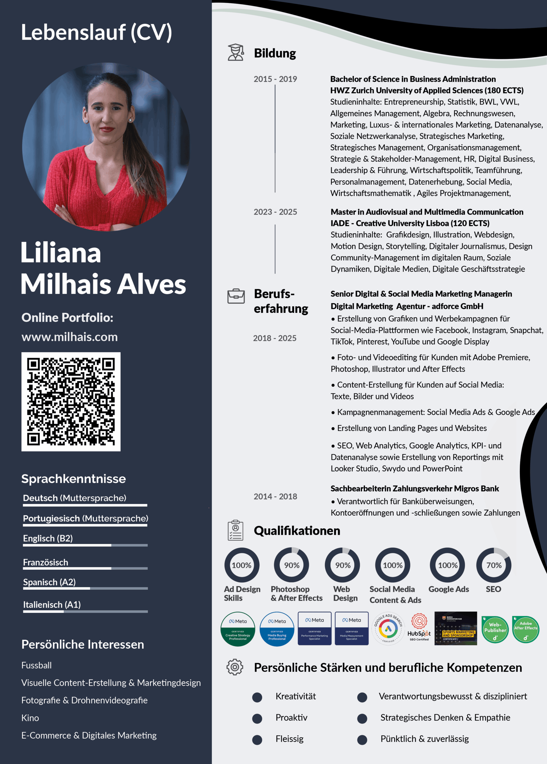 Ich erstelle Digital-Marketing-Kampagnen in Deutsch, Schweizerdeutsch, Englisch, Portugiesisch und Französisch. Damit kann ich Unternehmen in Zürich, der Schweiz und der gesamten DACH-Region mit mehrsprachigen Social Media Ads, Google Ads und Performance-Kampagnen unterstützen.